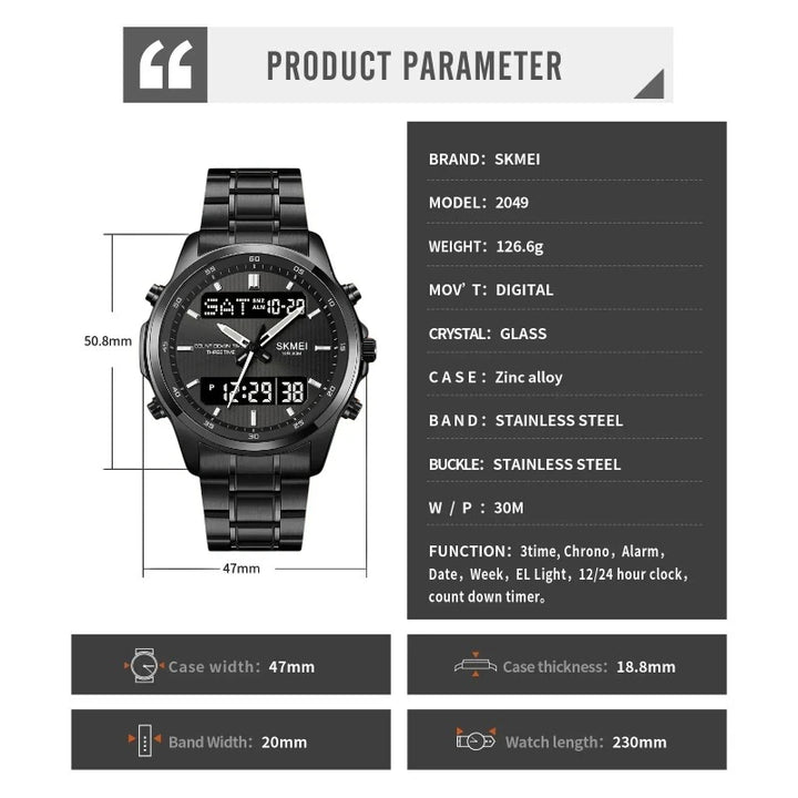 عرض مزدوج: عقارب + شاشة رقمية لقراءة الوقت والتاريخ والمؤقت بسهولة في أي لحظة.