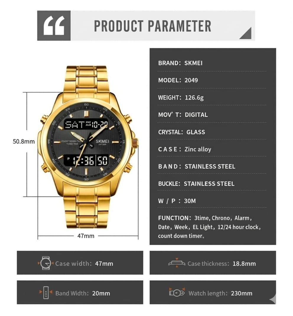 عرض مزدوج: عقارب + شاشة رقمية لقراءة الوقت والتاريخ والمؤقت بسهولة في أي لحظة. إمكانية ضبط المنبّه والمؤقت وإيقاف الزمن بضغطة زر واحدة، لتتبع جدولك اليومي بدقة. تصميم رياضي أنيق بهيكل متين مقاوم للصدمات، وقرص واضح برؤية عالية حتى تحت الشمس. إضاءة خلفية LED لرؤية رقمية واضحة في الإضاءة المنخفضة والليل. سوار عالي الجودة مناسب لجميع الإطلالات اليومية والرياضية. مقاومة ممتازة للماء للاستخدام اليومي – تتحمل غسل اليدين و رذاذ الماء والعرق